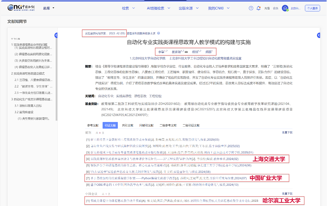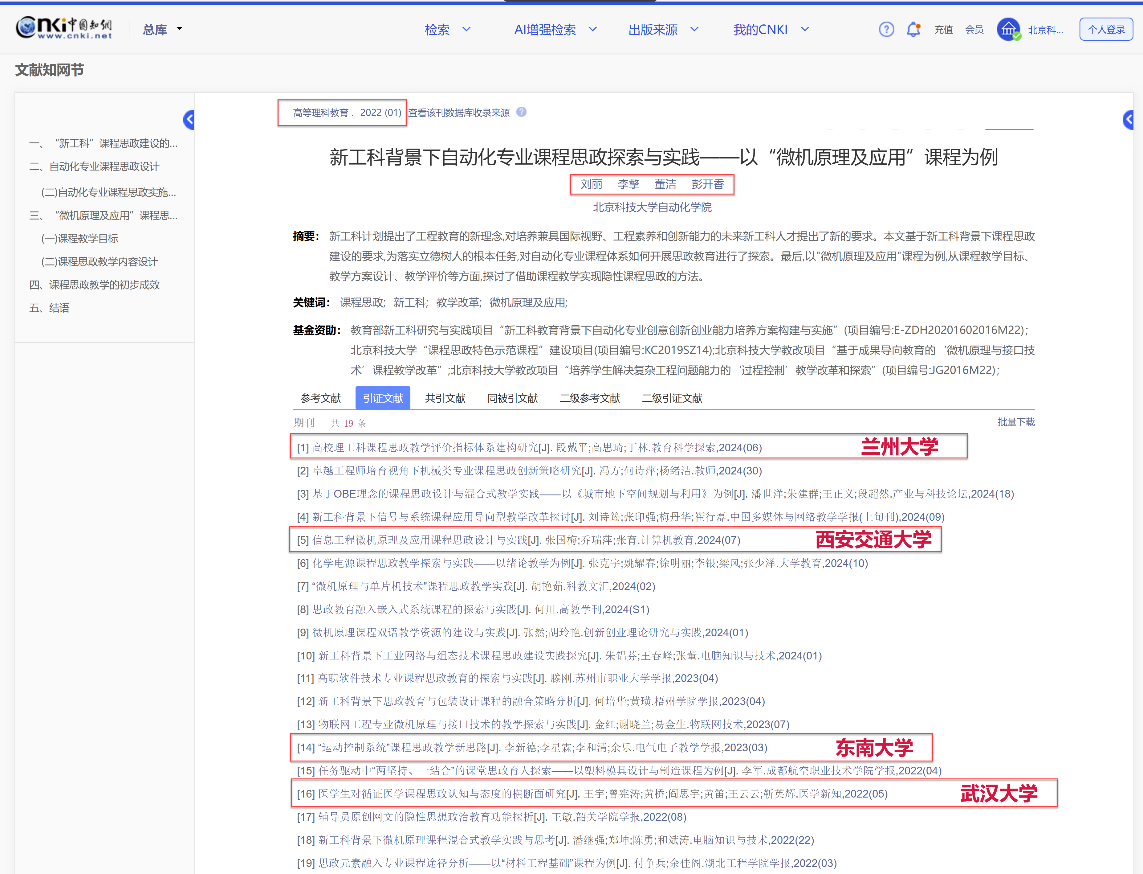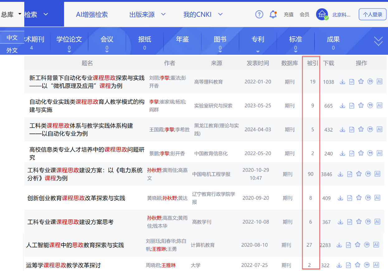 教师发表课程思政相关教研论文9篇,被上海交通大学、哈尔滨工业大学、西安交通大学、东南大学、华中科技大学、天津大学、山东大学、北京航空航天大学等100余所高校引用近170次,部分代表性成果及引用情况如下: