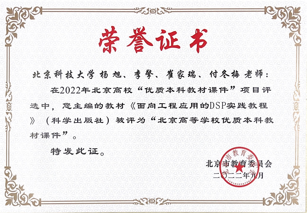 [38] 【优质教材奖】2022年9月,《面向工程应用的DSP实践教程》获北京高等学校优质本科教材