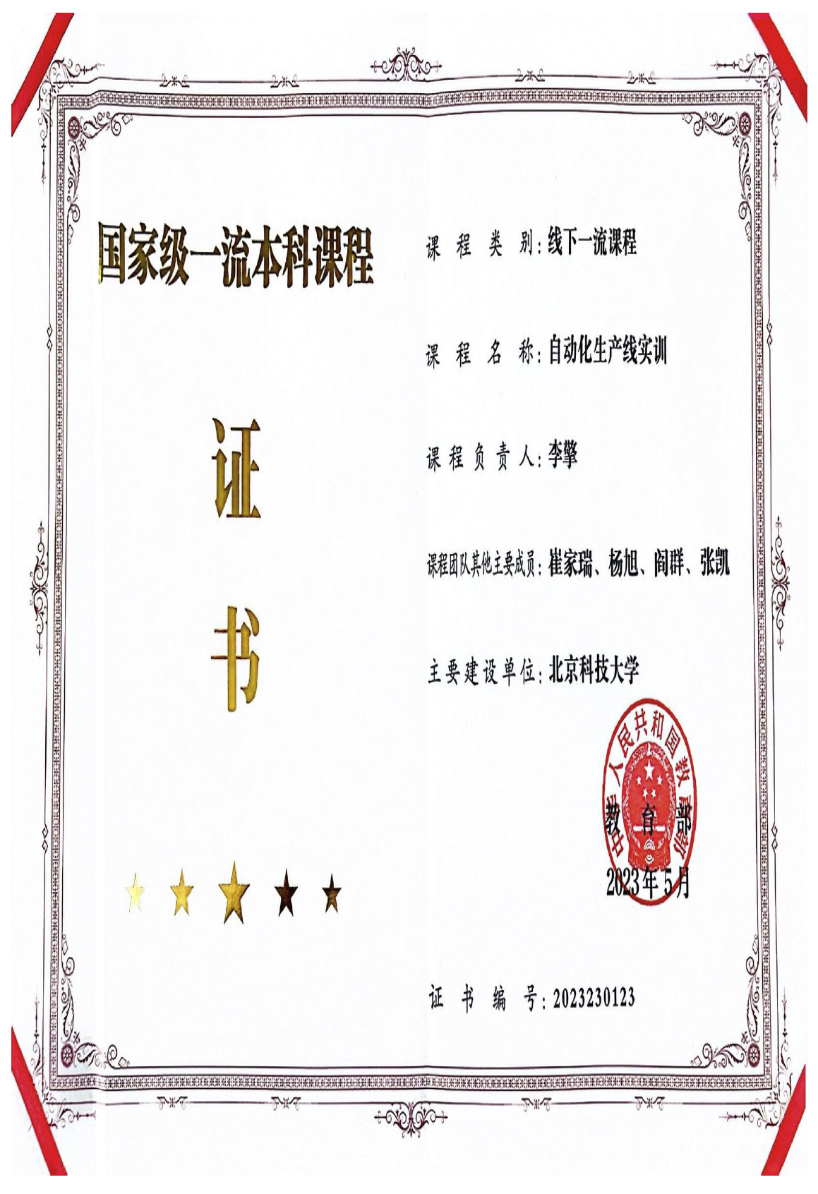 [9] 【国家一流课程】2023年6月,自动化生产线实训获国家级一流本科线下课程