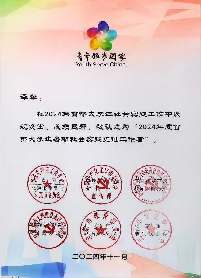 [27] 【先进工作者】2024年11月,李擎获首都大中专学生暑期社会实践先进工作者