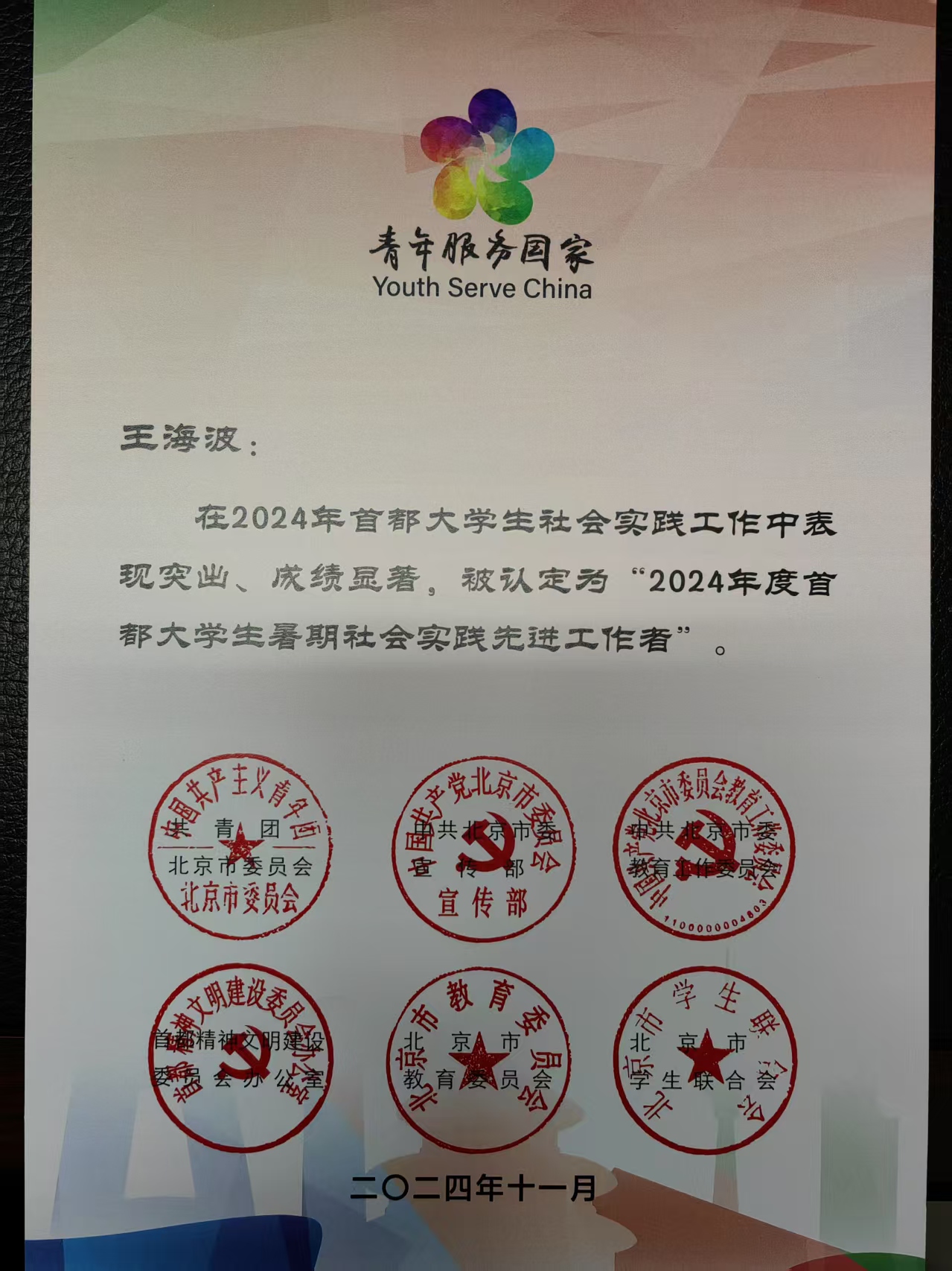 [28] 【先进工作者】2024年11月,王海波获首都大中专学生暑期社会实践先进工作者
