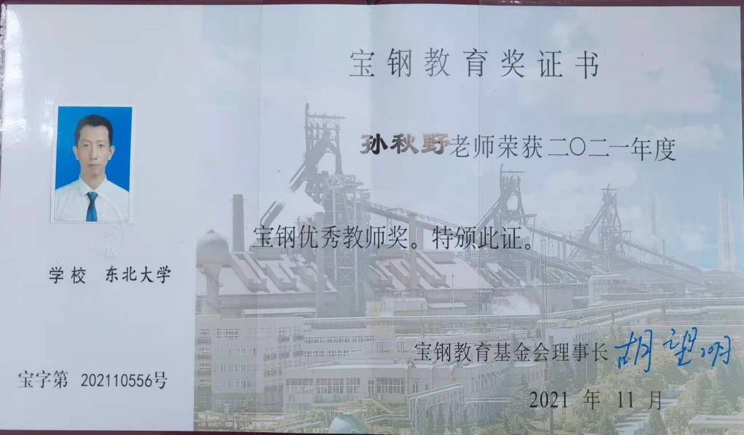 [24] 【优秀教师奖】2021年11月,孙秋野获宝钢优秀教师奖