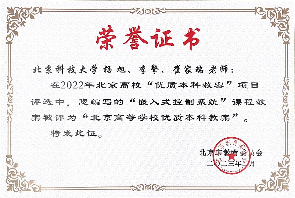 [41] 【优质教案奖】2023年2月,“嵌入式控制系统”获北京高校优质本科教案