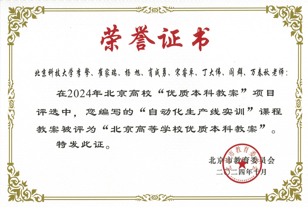 [40] 【优质教案奖】2024年9月,“自动化生产线实训”获北京高校优质本科教案