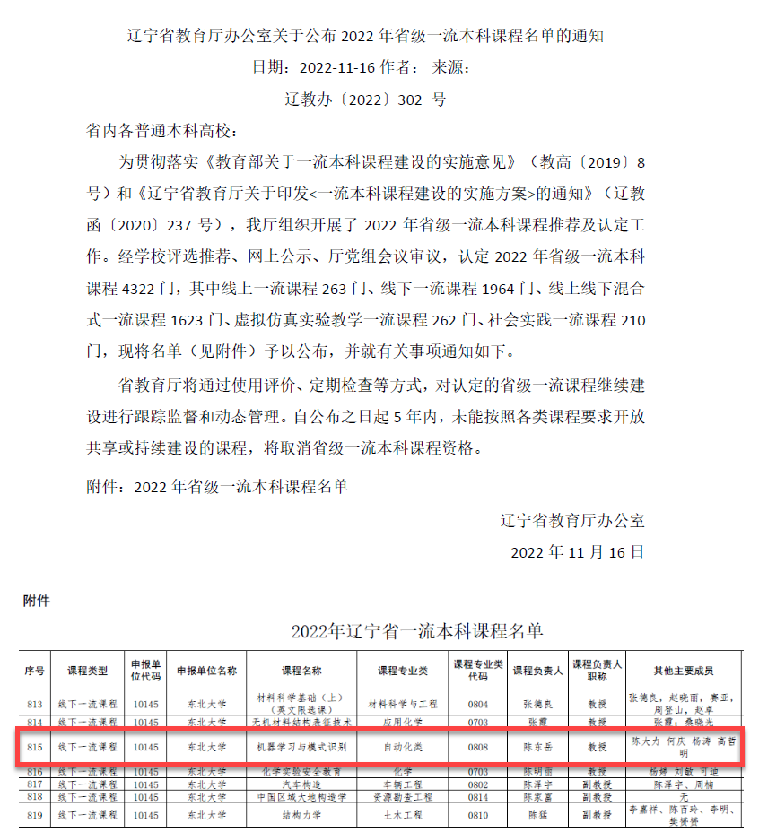 [35] 【优质课程奖】2021年1月,“机器学习与模式识别”获辽宁省一流本科课程